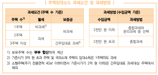 - 변경: 종합과세, 분리과세 중 선택 가능(단, 1주택 월세 소득은 비과세 혜택이 계속되지만 1주택 가액이 9억원을 초과할 경우에는 과세됩니다.)